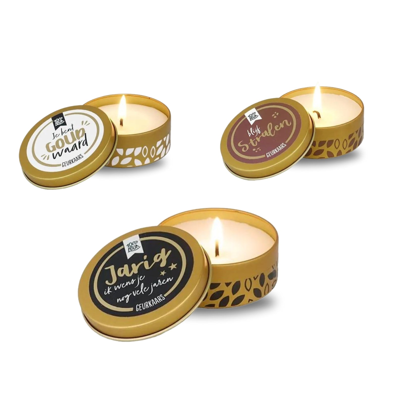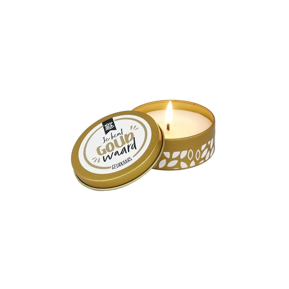 Je bent goud waard! Een mooier compliment kun je haast niet krijgen. Wie wil jij bedanken, compliment geven, of laten weten dat je blij met ze bent? Dit geurkaarsje zegt meer dan 1000 woorden. Zie het als een klein gebaar met een grote glimlach als resultaat. Als de ontvanger wat verder weg woont, stuur dan dit kaarsje met een LEUK kaartje op via de post. De geurkaars past door de brievenbus, dan hoeft de ontvanger niet thuis te zijn, maar is de verrassing extra groot! De geurkaars heeft een heerlijke geur van Spiced Apple.