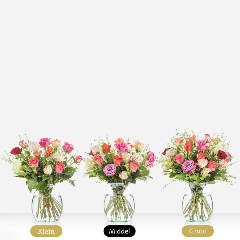 Verras met een prachtig rozenboeket, verkrijgbaar met 15, 21 of 27 kleurrijke rozen inclusief stijlvolle vaas. De kleuren variëren afhankelijk van de beschikbaarheid, waardoor elk boeket uniek is. Perfect voor elke gelegenheid!