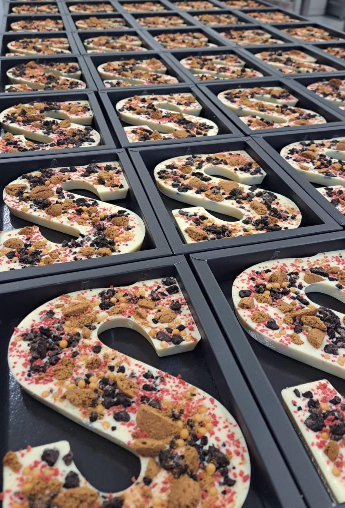 Proef deze heerlijke handgemaakte Belgische witte melkchocoladeletter, bestrooid met een verrukkelijke cookie van Oreo en salted caramel.