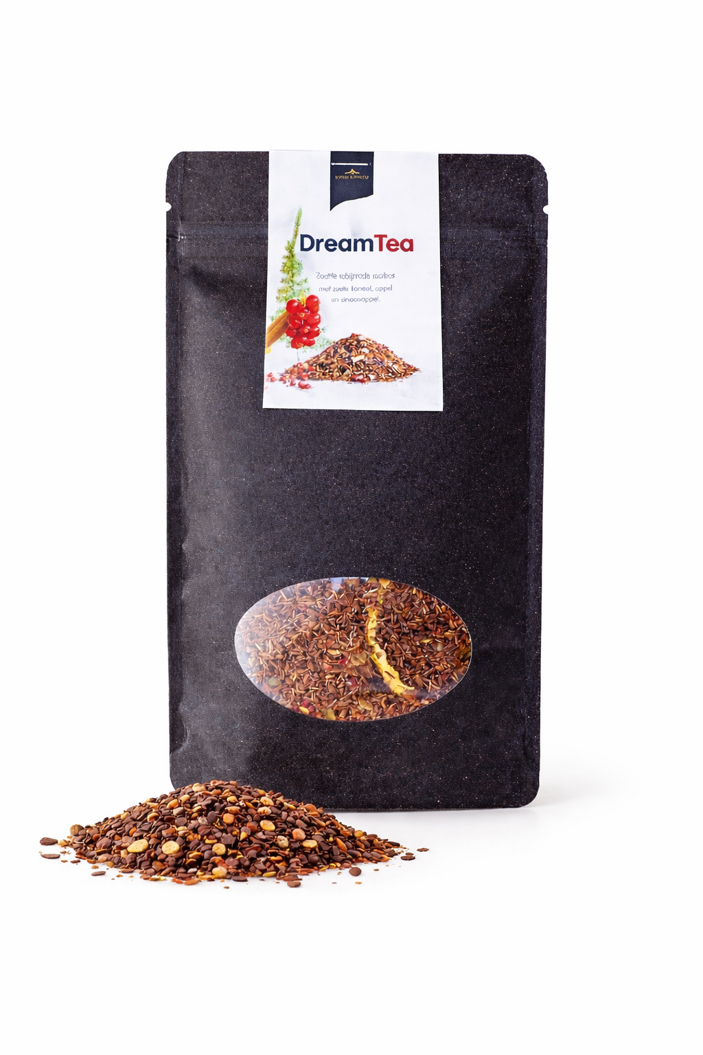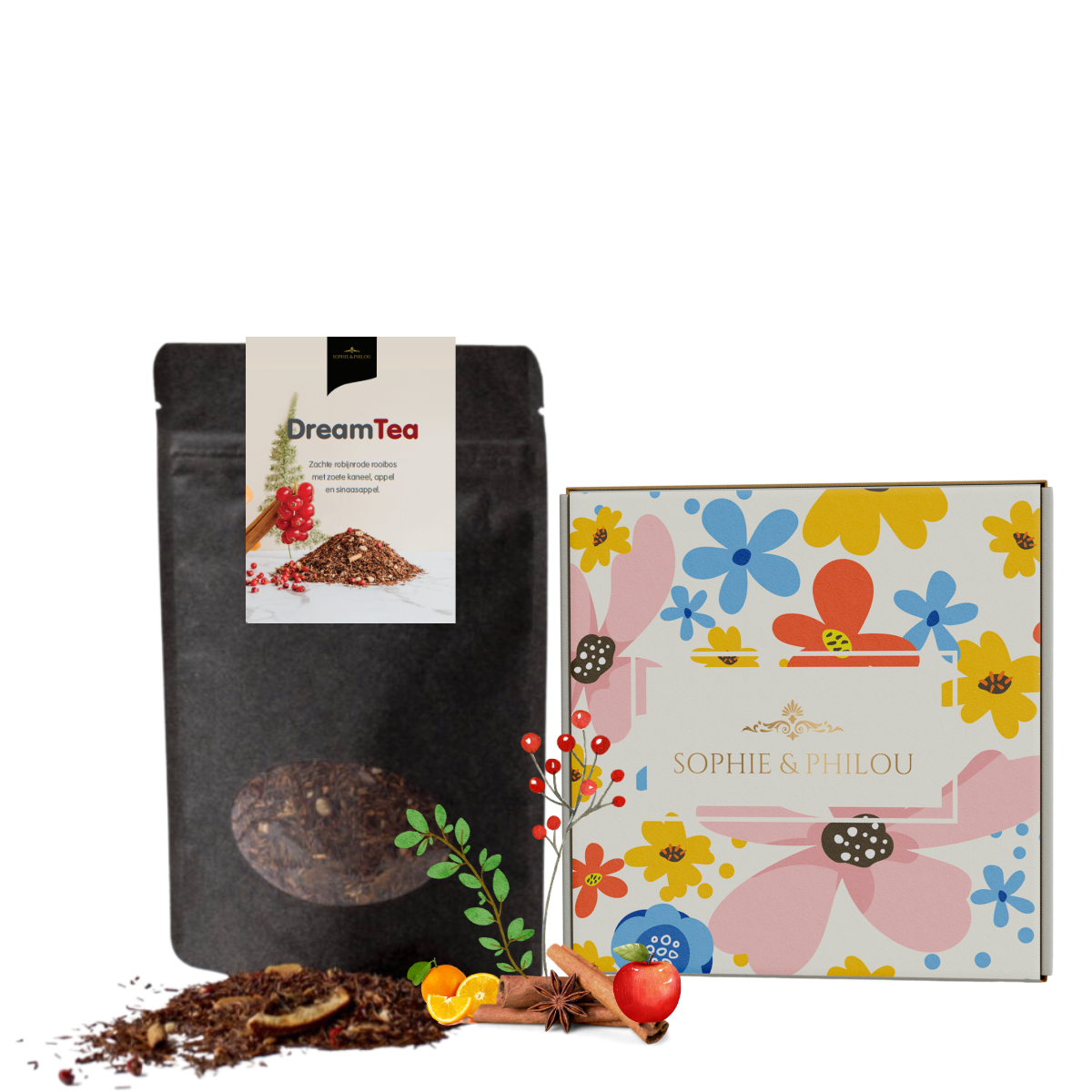 Ontdek de rustgevende wereld van Sophie&Philou's DreamTea, een heerlijke mix van kamille, lavendel, rooibos en kaneel. Deze thee omarmt je met comfort en sereniteit, ideaal voor ontspanning of een moment van bezinning. Sluit je ogen, geniet van een kopje, en droom weg in harmonie.
