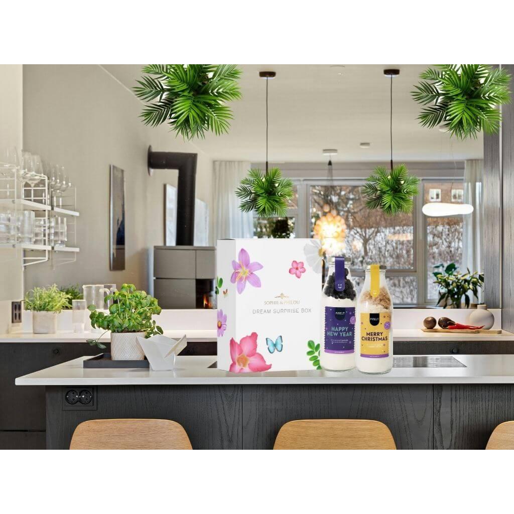 De Dream Surprise Box van Sophie & Philou is het perfecte geschenk voor de feestdagen. Deze luxe cadeaubox bevat twee heerlijke Pineut DIY-mixen in stijlvolle glazen flessen: